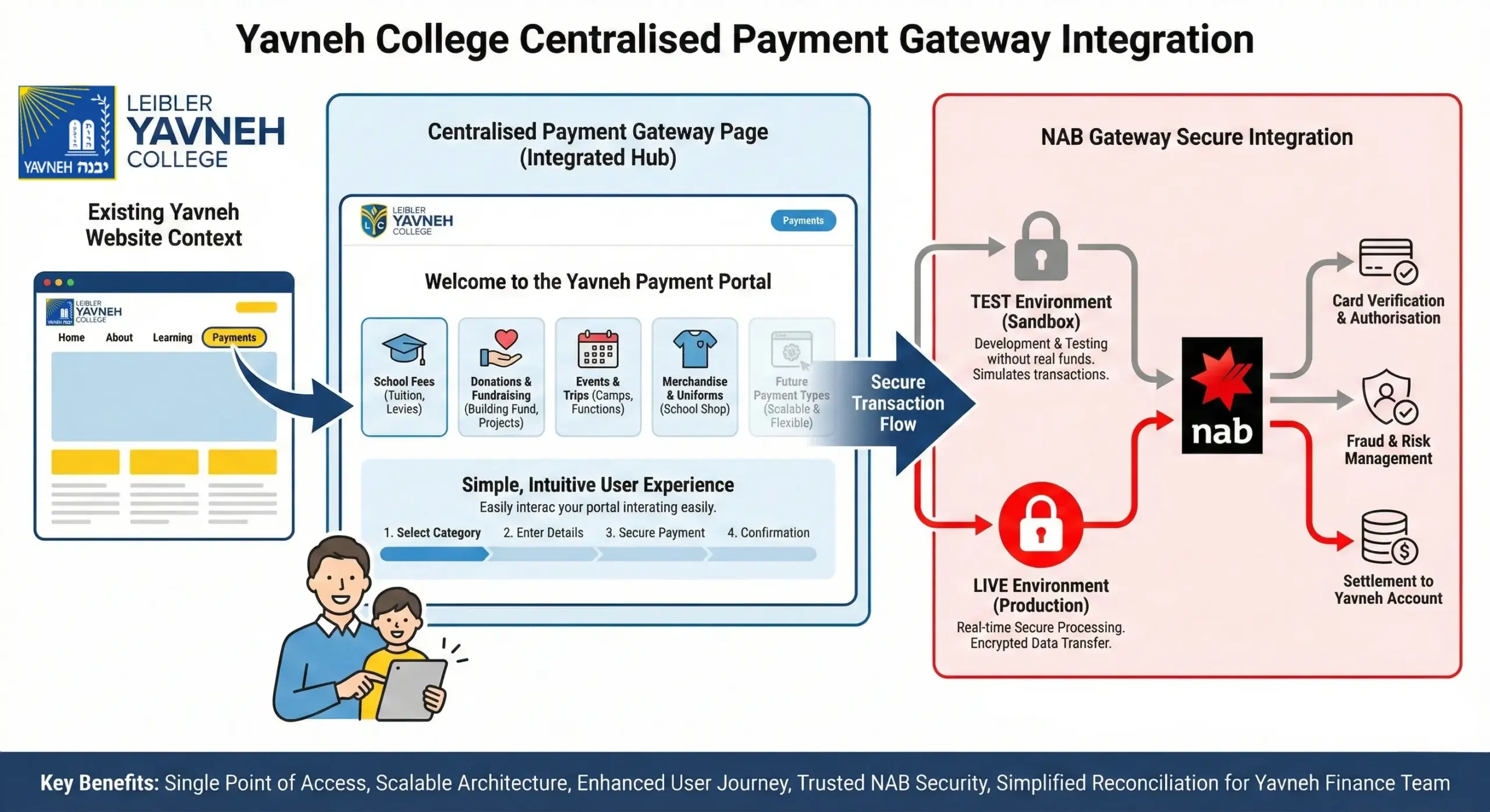 We propose a robust, secure, and custom-tailored payment gateway integration that aligns perfectly with Leibler Yavneh College's infrastructure. Our approach prioritises security, ease of use for parents and donors, and seamless backend reconciliation for the finance team.